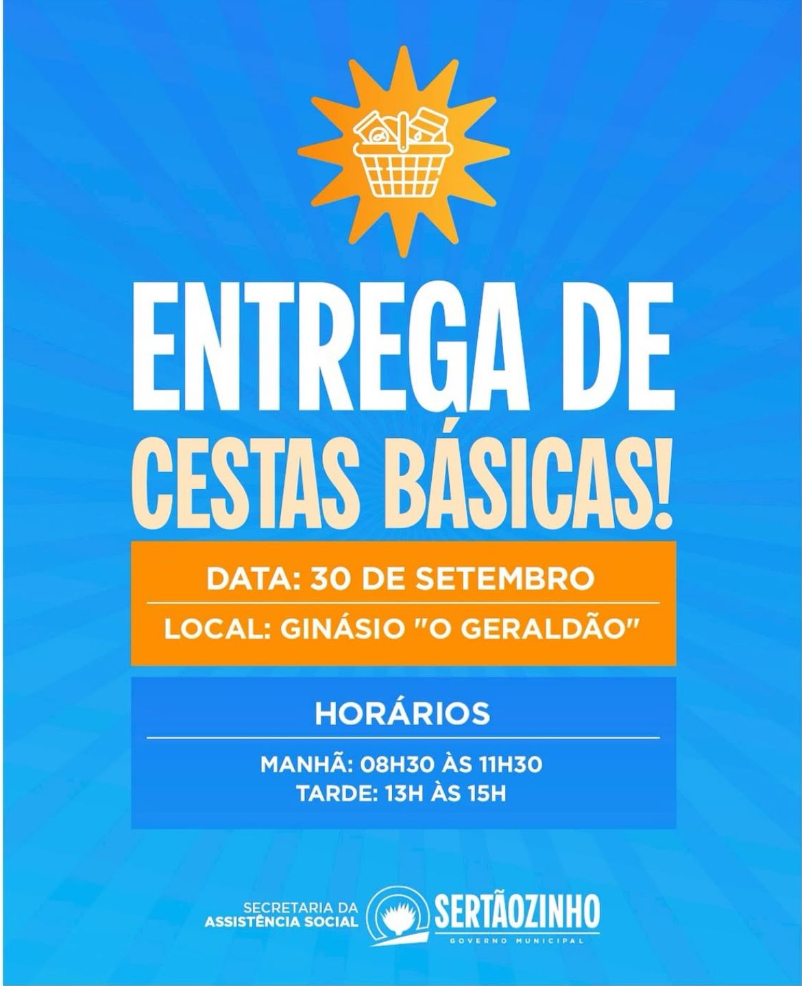 A Prefeitura de Sertãozinho, por mieo da Secretaria de Assitência Social, realizará a entrega de cestas básicas nesta sexta-feira, 30 de setembro, no ginásio de esportes "O Geraldão".
